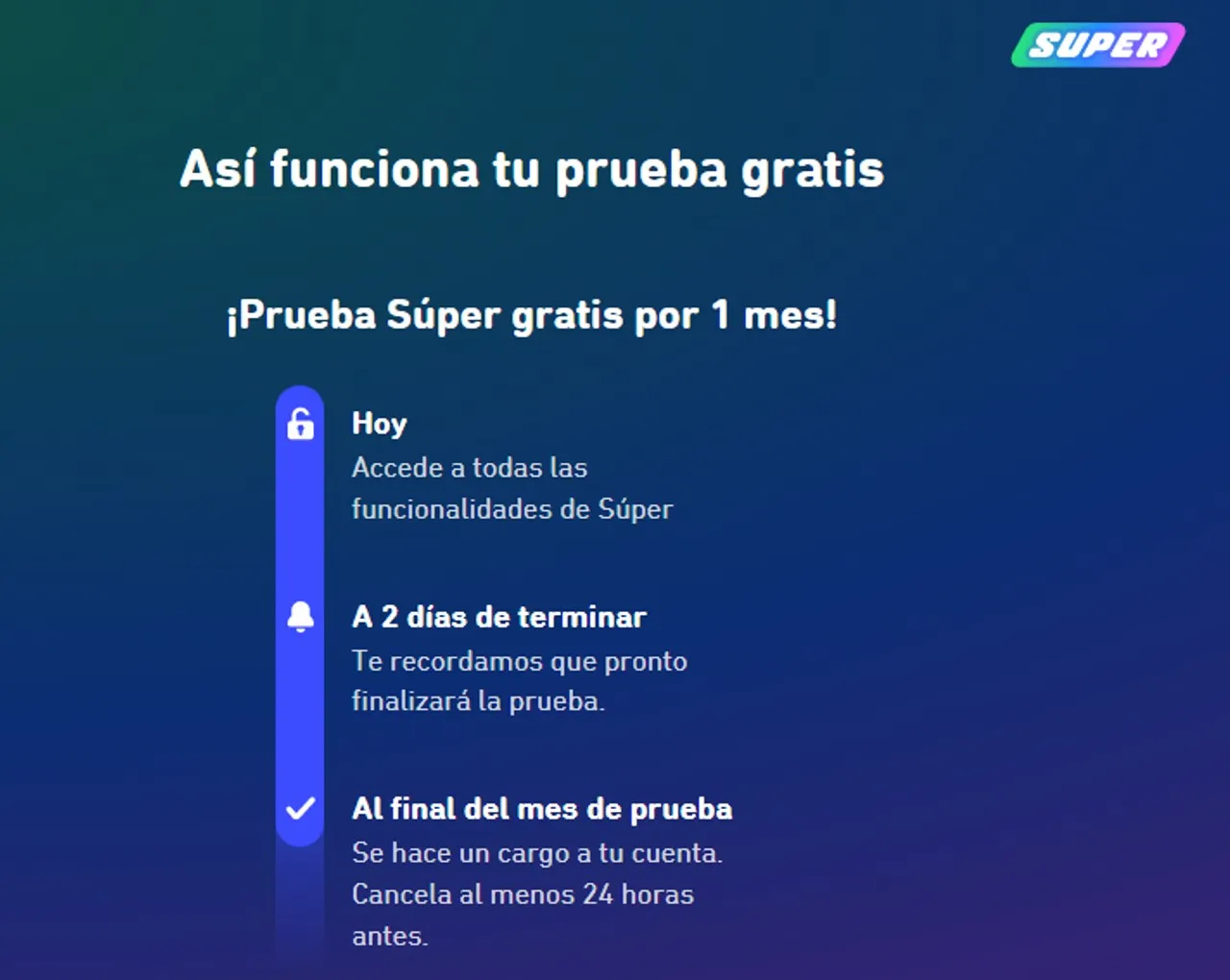 Una vez que demos clic en el siguiente enlace y tras ingresar un par de datos para registrarse (edad, nombre, correo, contraseña) podrá comenzarse a hacer uso de la prueba gratuita por un mes de Super Duolingo. Dos días antes antes de finalizar el periodo de prueba se enviará un recordatorio y al final del mes de prueba se realizará un cargo a la cuenta.